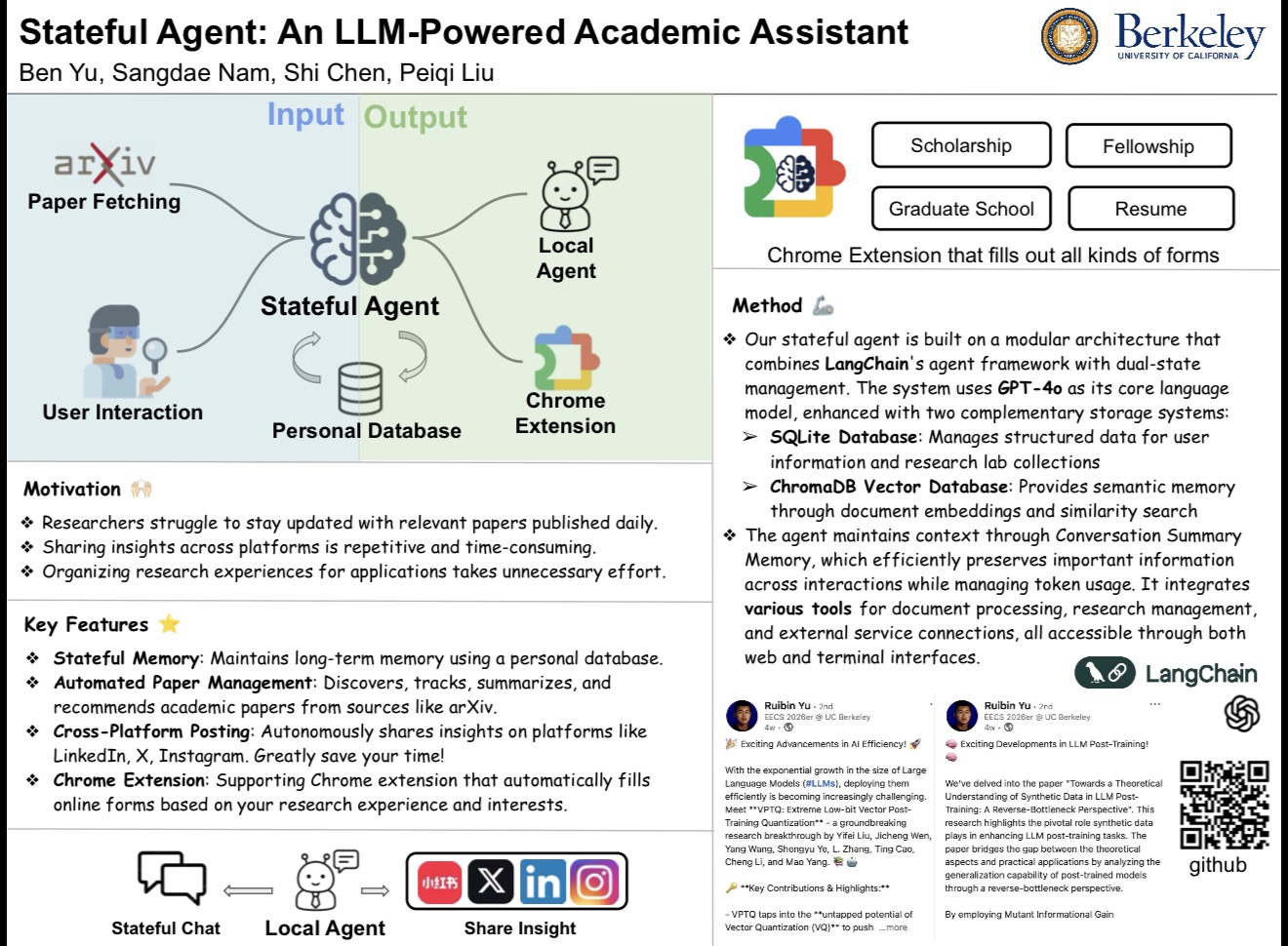 Developed a stateful LLM agent with persistent memory for academic research management. Built Chrome extension to auto-fill graduate school applications. Integrated automated paper discovery using LangChain + GPT-4o. Achieved 98% success rate in automated posting tasks.